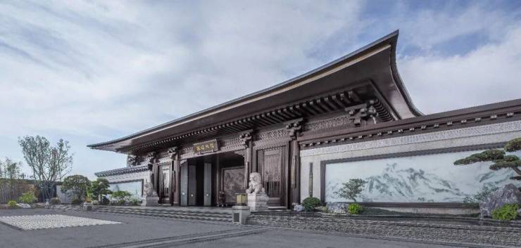 大门汲取唐代建筑形制,庄重雄伟,汲取宋代建筑细节,细腻典雅。两侧景墙如画卷般缓缓舒展,衬托出府门气势。