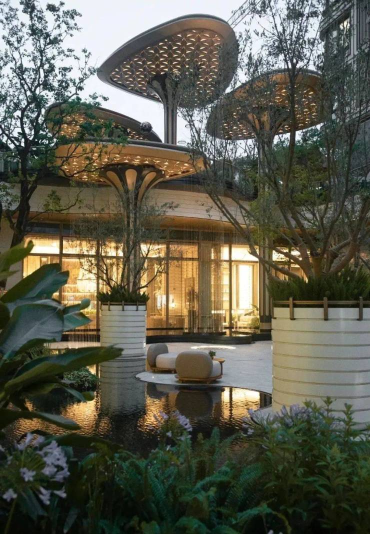 建筑风格:采用精致铝板装饰与通透大窗的美学立面设计,打造弧面窄框艺术之境,融合海派经典与宋式美学,彰显现代美学韵味。