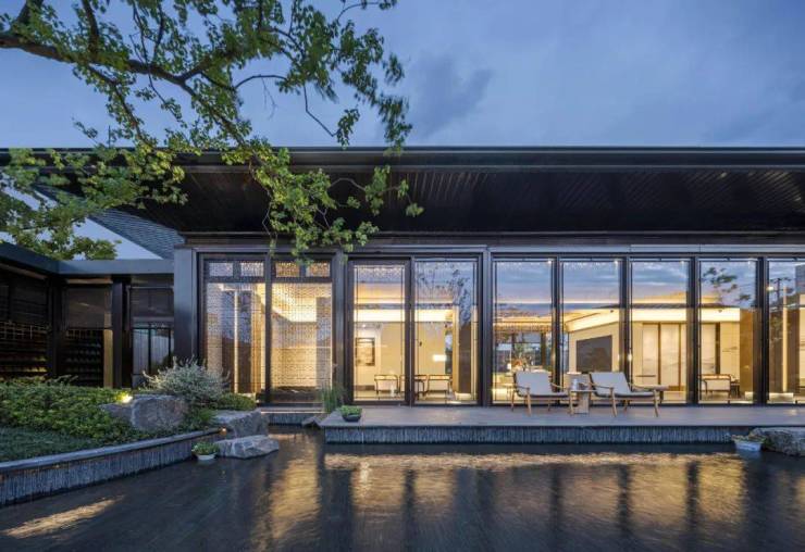 入口处,坡顶线条流畅且气势不凡,铜质门饰既雄浑有力又展现出精微细节。连廊串联会客、吟诗、作画、赏景、品茗、琴乐等宋代文人雅集的诗意生活情境,营造了层叠错落、曲折迂回的庭院空间。驻足庭前廊下,视线被不远处的中央水景所吸引,山水之间宛如一幅自然的文人水墨画。