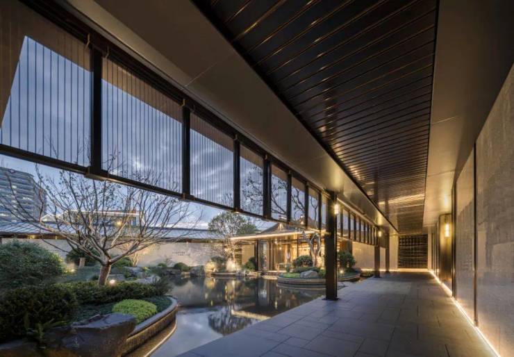 景观设计以叠山理水营造意境会客氛围,中央水景与连廊串联起各个景观空间,随着湖水与光线,各种绿色缠绕在一起,让室内外空间相互渗透。