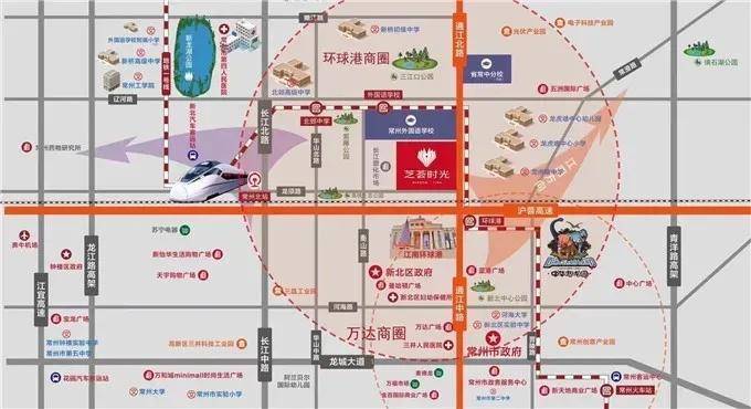 百兴芝荟时光位于新北区通江路与龙须路交汇处,占据高铁新城核心位置。项目周边路网四通八达,毗邻京沪高铁站、沪宁高速入口,距离地铁1号线常州外国语站、环球港站仅约100米。同时,项目南侧便是常州人气最火爆的商业综合体——江南环球港,衣食住行、吃喝玩乐等生活需求一应满足。