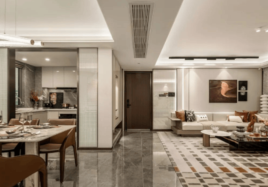 建筑设计:采用类公建化外立面,融合极简主义与酒店式美学,打造约6×70米阔景社区主入口,呈现高窗墙比,成为区域地标。