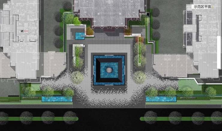 头门港海岸,潮水拍岸,海风清爽,幽深而富饶的海洋世界,寄托着许多人的自然情结。我们将来自大海的灵感运用在铺装之上,将蓝色领域的气息引入珑悦府。海水拍打出的浪花呈现着灵动的形态与多变的色彩,示范区铺装延续了海浪的渐变性和流动性,简化了海浪的复杂性。