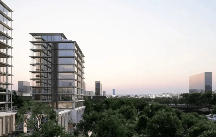 规划指标:4 幢 12–17 层小高层,仅 96 户;容积率 2.4,绿化率 35%;全抬地设计(首层离地约 12 米),标志性 12 米高拱券主入口;