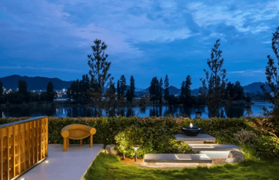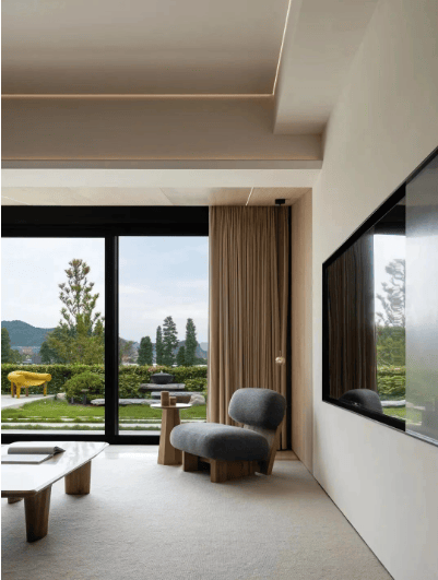 原建筑是江南合院风格,窗格密集,采光和视野受限,设计师第一步就是把小窗替换成大面积系统玻璃门窗,让湖景、山景都能最大化进入室内,自然光线和景观成为空间的“主角”,减少人工装饰的负担
