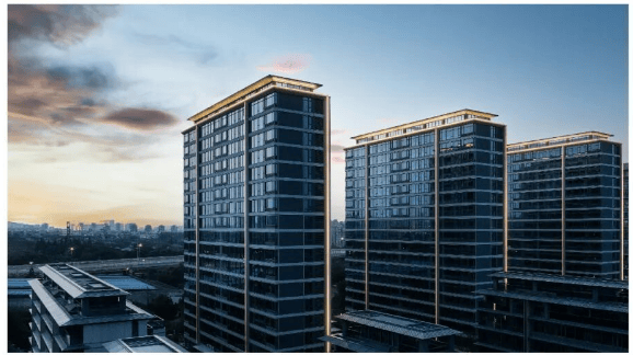现代美学建筑由中国美院团队操刀设计,高层采用铝板 + 玻璃幕墙组合,窗墙比达 65%,搭配莫兰迪色系,呈现极简现代质感;叠墅以全铝板外立面及大面落地窗,营造通透轻盈的视觉效果。