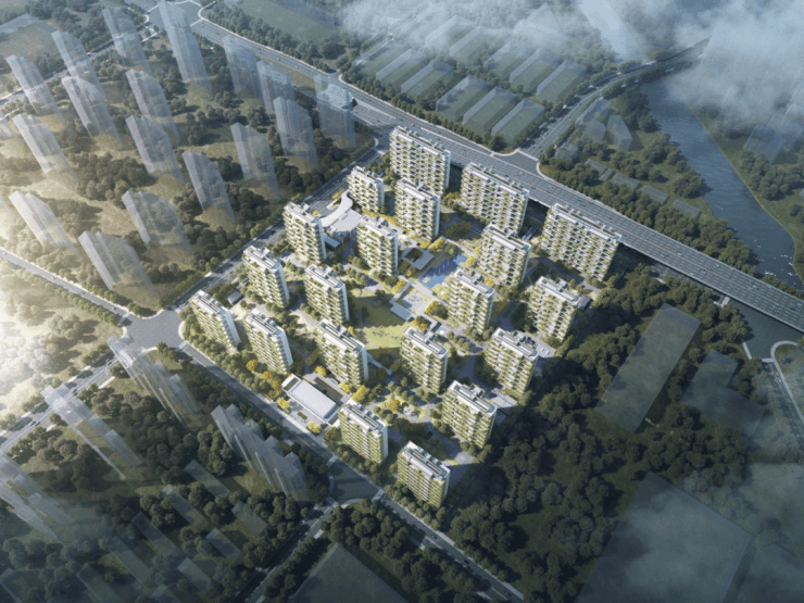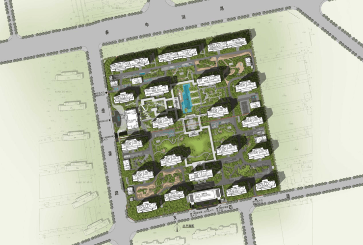 规划设计:项目规划布置20栋高层住宅,层数在12F-17F之间。楼宇采用错位布局的方式,形成"城市森林岛屿"的视觉效果;在地块内部围合1000㎡中心景观花园,同时融入苏州园林造景手法,形成户户享有立体庭院景观,实现"推窗见绿"的生活体验。