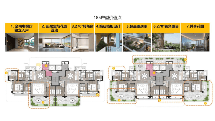 185㎡主力户型特点:全明电梯厅;270°转角空中庭院;转角景观窗;隐私挡板设计;起居室与空中花园互动。