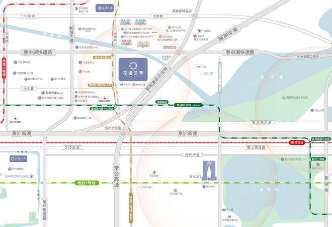 高铁:高铁北站,未来将打造“相城-虹桥”15分钟快线。高速:自驾5公里约10分钟可上G42沪宁高速、G15W常台高速。双高架:春申湖快速路,出门即上,可快速通道园区和新区;苏州北站高架路,自驾1km可转,北部到高铁新城、南部到姑苏和园区湖西CBD。双地铁:轨交7号线,项目紧邻行政中心北站约100米,预计2024年年底通;轨交8号线,行政中心南站约1km,预计2024年年底通车。二横二纵路网:【二横】华元路与阳澄湖中路、【二纵】澄阳路与相城大道