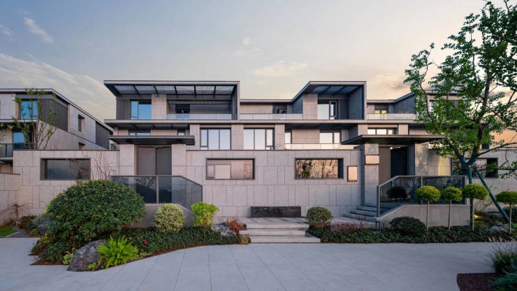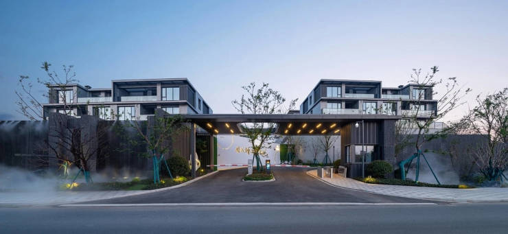 建筑设计:建筑立面采用灰色新珍珠蓝石材与大面积玻璃,搭配金属收边、坡顶设计,兼具现代简约与经典美学。