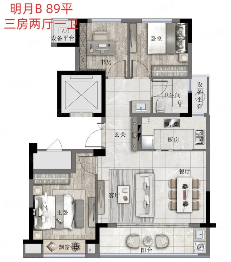 89方边套/89方中间套,三房两厅一卫