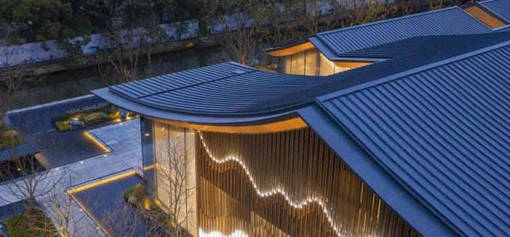 古韵新生的建筑形体辅以 独特匠心的施工细节,施工工艺的一次次磨合,巧妙结合场地的现状,因势造景,在有限的空间里打造出一片极具标志性和构造韵律感的建筑剪影。