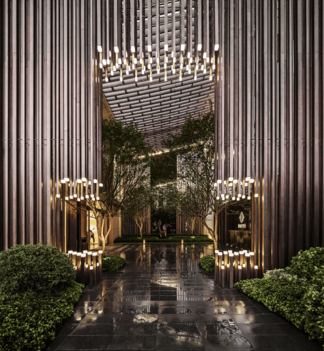 景观设计:浅米色外立面,线条简洁,营造出精致奢雅的美学气质。住区绿植如荫,会客廊架、阳光草坪、下沉式围合休闲庭院穿插其间,还有别具艺术气质的景观小品点缀,依势造景,层层递进,营造出立体丰富的归家风景3。