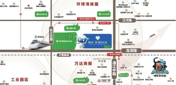 交通:出行十分便捷,距离地铁 1 号线常州外国语站、环球港站仅约 100 米,且毗邻京沪高铁站和沪宁高速入口,周边路网四通八达。