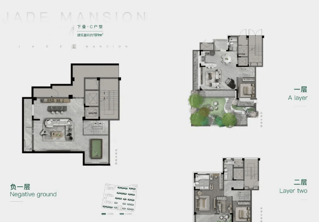 叠墅户型:建面约 190-224㎡的三开间叠墅,包括下叠、中叠和上叠,部分下叠带有庭院,上叠带有露台,可满足不同客户的需求。