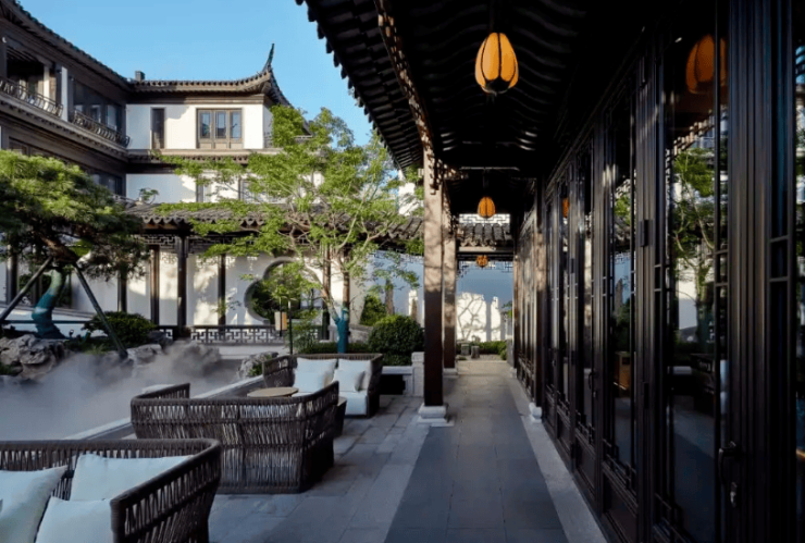 纯中式合院定位,全石材干挂立面(仿古砖 + 灰瓦),断桥铝双层中空玻璃定制门窗;三进院落、前庭后院、四水归堂的传统格局,门廊、影壁、月洞门等元素融入福、禄、寿寓意;打造 “一园九景” 江南园林,移植百年香樟、红枫、太湖石叠山,曲水流觞,氛围感极强;社区采用人脸识别 + 24 小时监控的智能安防体系。