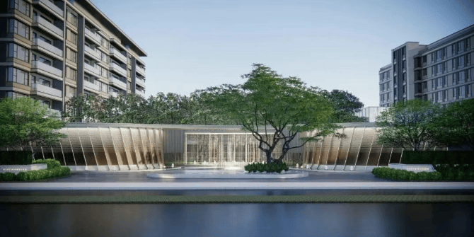酒店式设计:设计灵感源自安缦、丽思卡尔顿等高奢酒店,社区入口的 85 米显赫门庭,采用双曲线香槟金铝板与贝金米黄奢石,彰显尊崇感;酒店环岛式入户方式和人车分流的地库入口,提升居住便捷性与舒适度。