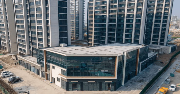 建筑风格:采用现代风格,以灰白色石材为底座,搭配大面积镜面蓝 LOW - E 玻璃,窗墙比超 60%,洋房屋顶搭配深灰色挑檐铝板,质感轻奢。