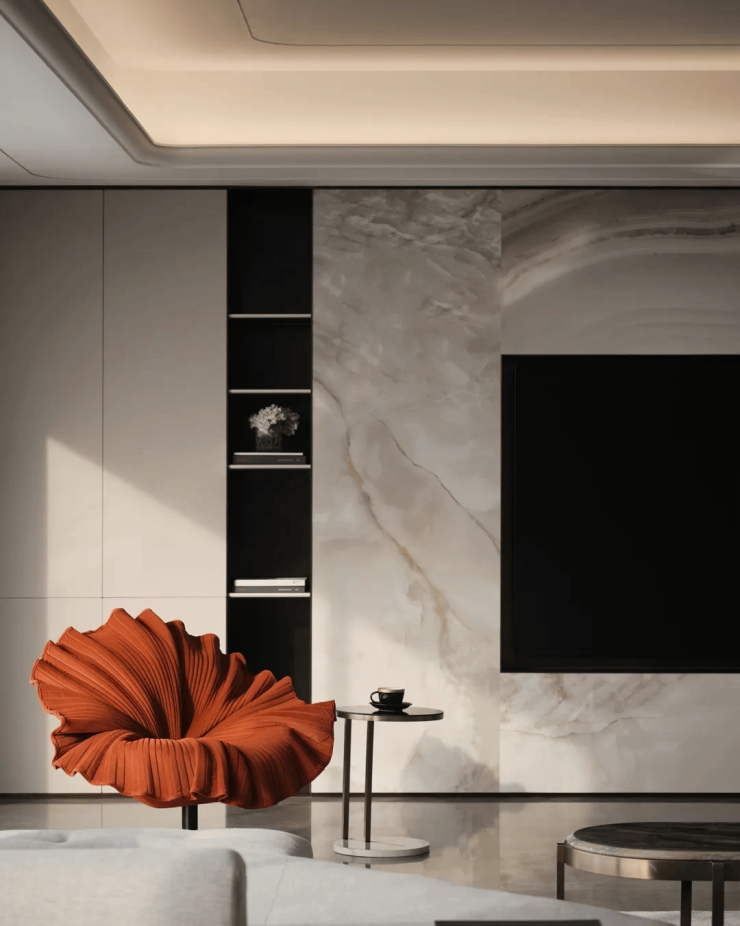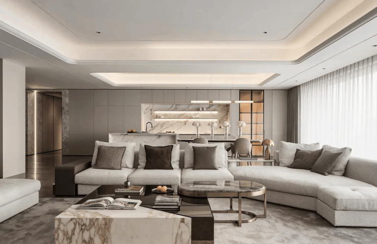 客厅的陈设简洁而有秩序感,优雅的沙发与窗外的无限景色相互映衬。当光线洒入室内,自成一景,完成了一场令人愉悦的空间体验。设计师巧妙地预留了社交场景的弹性,为人与人、人与未来的关系做好了准备。