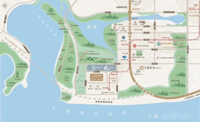 生态配套:项目周边自然环境优越,有蠡湖湿地公园、长广溪湿地公园、贡湖湾湿地公园、尚贤河湿地公园、金匮公园、金城湾公园等,还有鼋头渚景区、央视影视基地、融创文旅城、巡塘古镇、雪浪山生态园等景区。