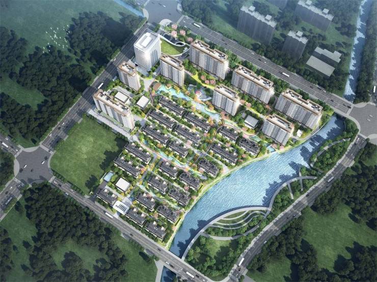 项目东面紧邻约150亩的贝港滨水公园。 项目建筑风格融合了奉贤柘林滚灯元素和海浪造型,寓意“乘风破浪,扬帆起航”,自带恒温泳池。 中国中铁世纪尚城秉承“绿色、运动、智慧”三大核心特色,设计风格采用引水入园,枕水而居,打造高品质低密滨水岛居墅区。
