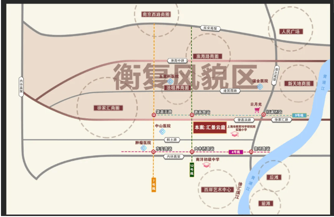 汇景云庭紧挨着徐汇区复历史风貌区,即景泰大厦坐落于斜土路1175号,步行500米就可以到达9号线和12号线嘉善路站,2站可达徐家汇商圈、南京西路商圈。距离地铁4号线约800米、13号线约1.5公里,内环内得天独厚的地理位置。毋庸置疑这样的地段享受的必然也是城市塔尖级的高能配套。
