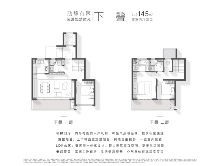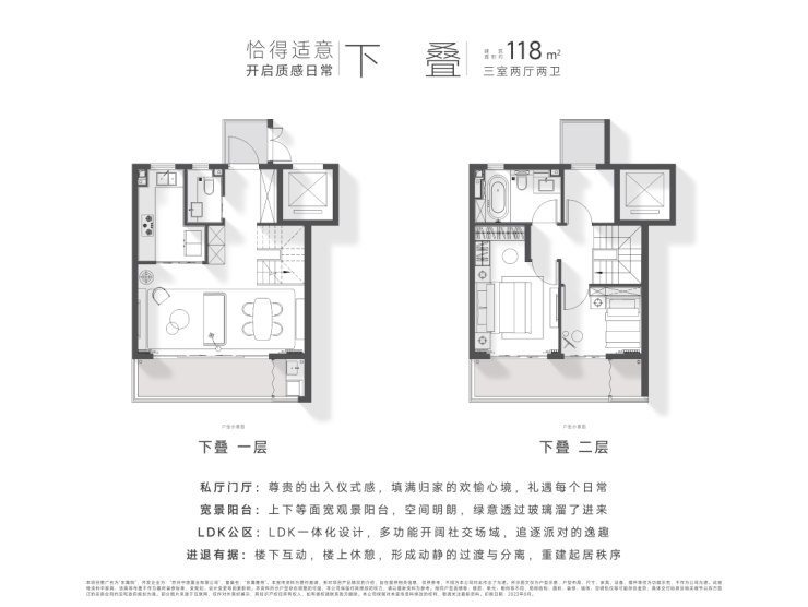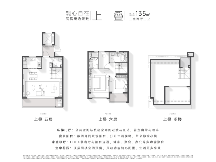 定制空间:全横厅设计、LDK多功能家庭区;功能间配置+灵动空间设置;建面约135㎡以上户型,全3卫配置,居住品质更高。