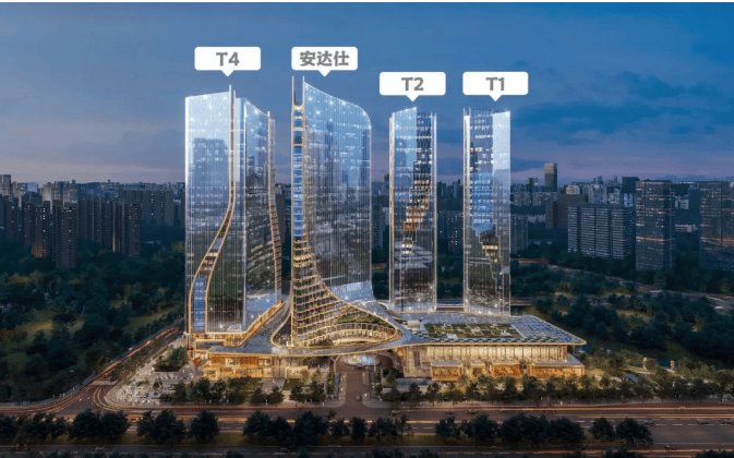 总建筑面积约26.05万平方米,由4栋140-160米高的塔楼组成,包括T1、T2为珍品公寓(共98套),T3为安达仕酒店,T4为超甲级写字楼,基底包含会议中心、酒店宴会厅、商业、艺术中心等配套。