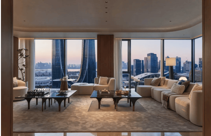 采用2.4米超宽水晶玻璃幕墙,实现270度全景视野,可俯瞰钱塘江、奥体中心等地标景观。