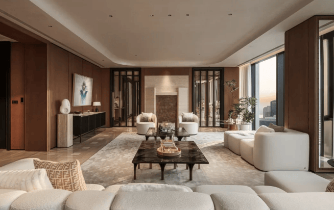 公寓主力户型为370㎡、740㎡、1080㎡(跃层),层高4.2米,配备全屋无柱转角落地玻璃、开放式西厨区、独立娱乐空间等,部分户型设有双联厅设计。