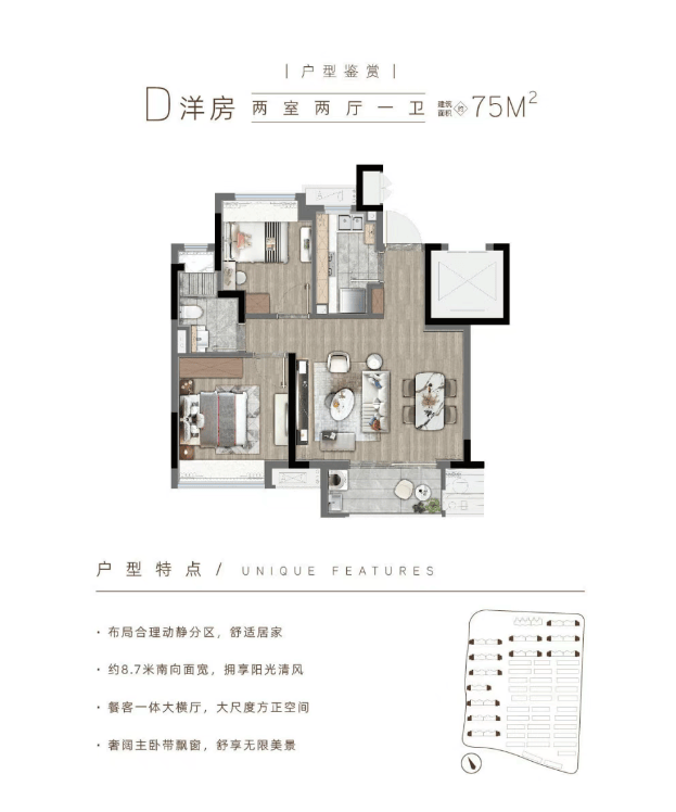户型面积:在售面积洋房为 75㎡,联排为 89-109㎡