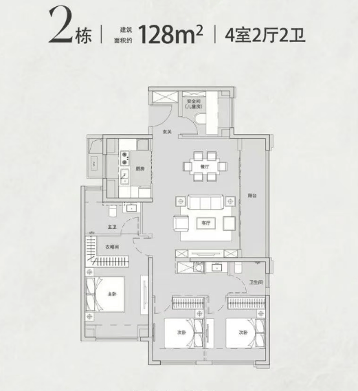 128㎡户型:有超高层 T3-128㎡户型 - 3 面宽朝南 / 3 面宽朝东和超高层 T5-128㎡户型 - 4 面宽两种。前者为三开间朝南,极致四房设计,有独立玄关、阔景大横厅、LBDK 客餐厅一体化、干湿分离、奢雅主卧套;后者为南向四面宽,6.3 米宽景阳台连接客餐厅和次卧,采光充足,四房设计,均能满足成长家庭的一切功能需求,客餐厅及主卧开间尺寸大于竞品。