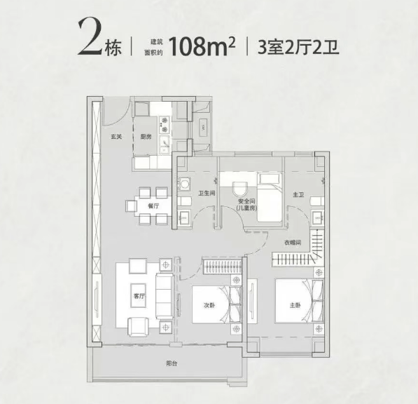 108㎡户型:为超高层 T3/T5 户型,3 面宽设计,有独立玄关、宽景阳台、U 型厨房、奢雅主卧套,户型方正实用,主卧飘窗全赠送,南北通透,动静分离,客餐厅及主卧开间尺寸均大于竞品,舒适性更佳。
