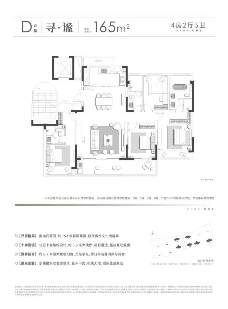 户型起步165㎡,最大248㎡,定位纯粹的低密大平层社区。每个户型都是双联阳台,最大的尺度做到了11.2米。