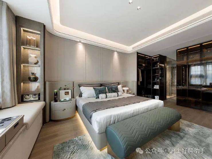 南北通透的主卧套房,则是另一种“极致”,将主卧小家化的功能性得到了充分释放,但同时酒店式的设计则为私密空间的舒适度与空间仪式感给予了最佳的氛围;更阔绰的飘窗设计,不仅让室内空间更拓展,视野更开阔,还能承载更多功能,坐在飘窗上品茗、读书,享受午后阳光的轻抚,听耳边小鸟的低鸣,生活就是这样惬意。