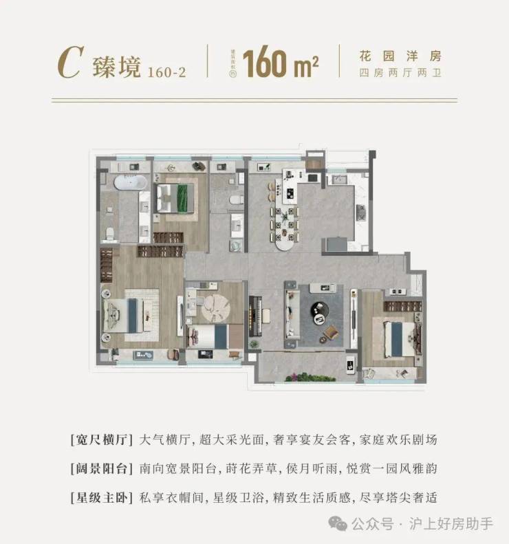 约160平方米的大宅,同样4开间朝南,更奢阔的空间,更自由的生活。动静分离,主卧更有步入式衣帽间,女主人的梦想都在这舒适的空间中一一实现,三卧朝南,北房间自由灵动,一间音乐室,或是图书室,也可以是书房、观影房……总之随心所欲。