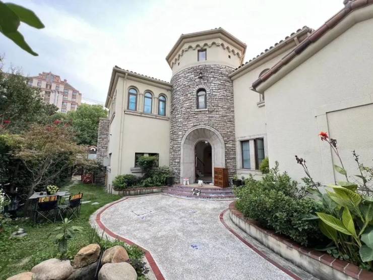 建筑风格:纯正南加州风格,石材 + 文化砖外立面,拱门、坡屋顶、廊架,私家庭院 + 下沉式花园。