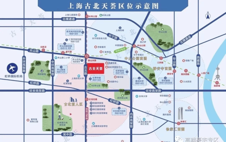 『古北天荟』项目位于上海市长宁区古北路、位于古北路和茅台路交叉口,属于中山公园商圈,商业配套成熟,毗邻金虹桥广场,尚嘉中心等商业综合体。交通及出行便利,周边生活环境优美,配套成熟完善,属于上海的老牌富人区。