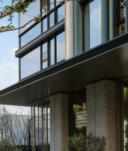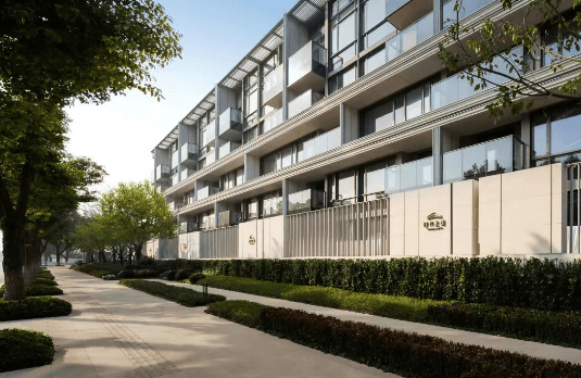 建筑设计:聘请GAD等国际知名设计团队,建筑立面采用现代极简风格,高层以天青色铝板与Low-E玻璃搭配,叠墅采用经典三段式设计,融合天青色釉面陶板与大面玻璃开窗,既彰显时尚前卫,又兼顾采光与视野。