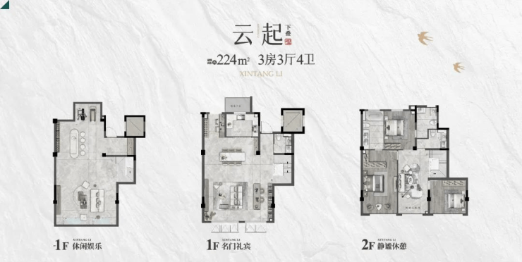 户型面积:平层185㎡,上叠208㎡,下叠224㎡