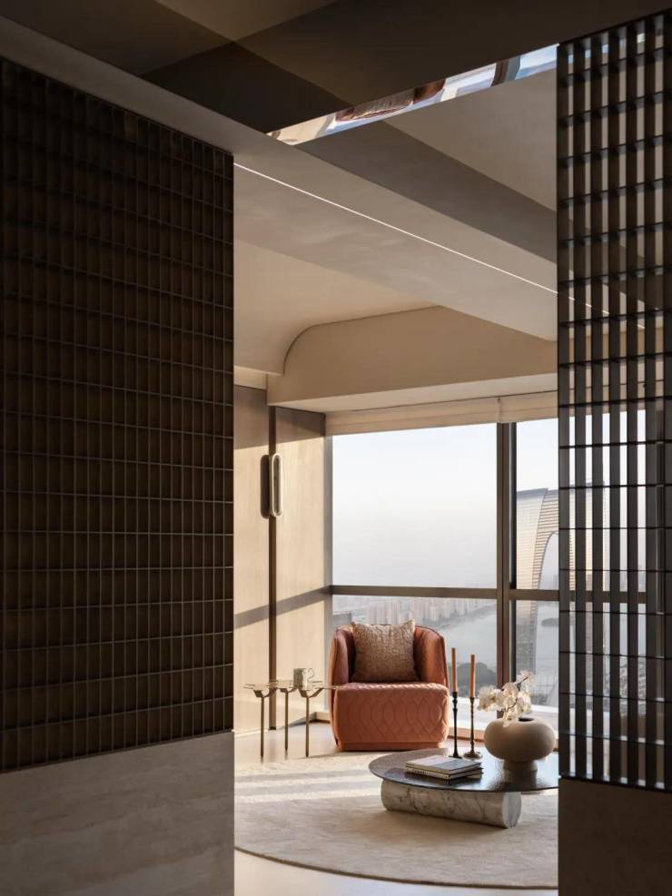开放的客餐厅空间独揽窗外风光,利用优质的景观资源形成开阔的视野空间。空间中大量采用温润柔和的材质,以材质传达情绪,这种平易哑喑的肌理让人感到愉静沉淀、精神安然,在无形中感受被沉淀下来的生活气息。