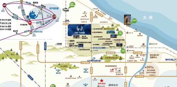 周边配套:交通上,紧邻 G50 高速路口,距离湖州高铁站约 20 分钟车程,距离长兴高铁站约 10 分钟车程。商业方面,自带五大生活广场,周边还有龙之梦购物中心、月亮广场、奥特莱斯购物中心等。教育资源上,项目自带 15 个班的幼儿园,周边还有太湖图影小学等。医疗配套有浙北医学中心、南太湖医疗保健中心等。此外,项目紧邻太湖龙之梦乐园,周边还有 4A 级图影湿地公园等旅游资源,环境优越