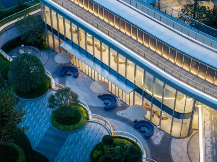 景观设计:以滨江标志性的蓝宝石水池为核心,打造 “一心、三岛、五进” 的园林景观,营造轻松惬意的游园体验。此外,还设有荧光广场,融萃灯光水秀、光环地灯、时尚水景和主题雕塑