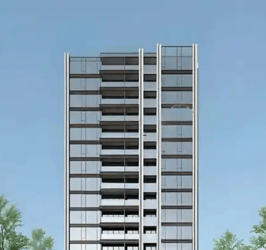 外立面:高层四面白金色铝板 + 茶金色 Low-E 玻璃;基座 / 公区用保加利亚进口米白莱姆石(带珍珠母贝光泽)