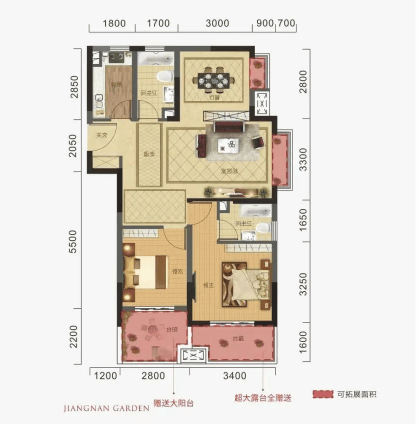 部分户型设计有超大露台,赠送面积多,得房率高达 95%。