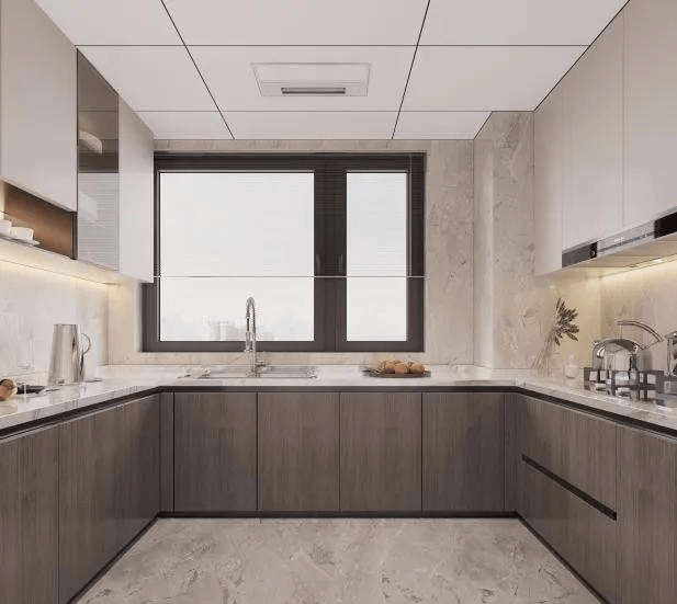 约12.2㎡的中西U型双厨房设计,不仅能容纳多人同时操作,还能满足不同人的需求习惯。父母喜欢传统中餐,孩子要吃牛排甜点,三代同堂,需要满足每个人的饮食需求,可谓实用性与美观性同存。