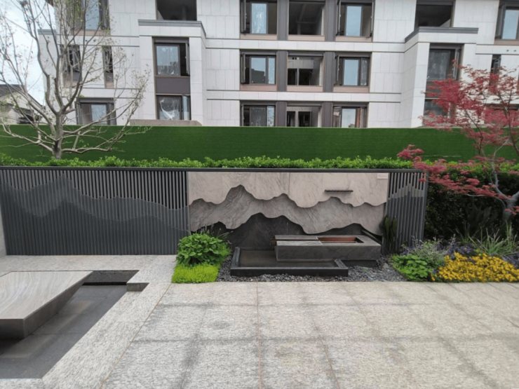 从大门入户开始,场景布置便按照传统风水布置。据置业顾问介绍,整体的布局呈现水聚天地、四水归堂的一个风水布局,两边呈对称分布。老石臼承接雨水——聚水聚气聚财,摆放太湖石——“石”来运转,大门到庭院共有三道门——三进门,无不显露出江南玺对于风水方面的注重。