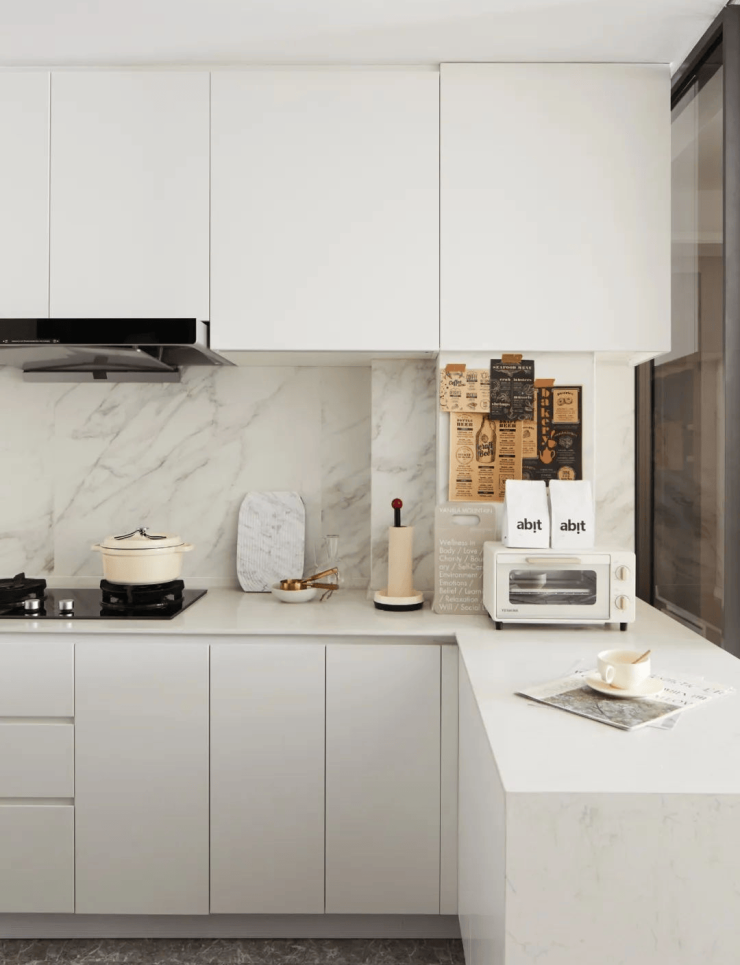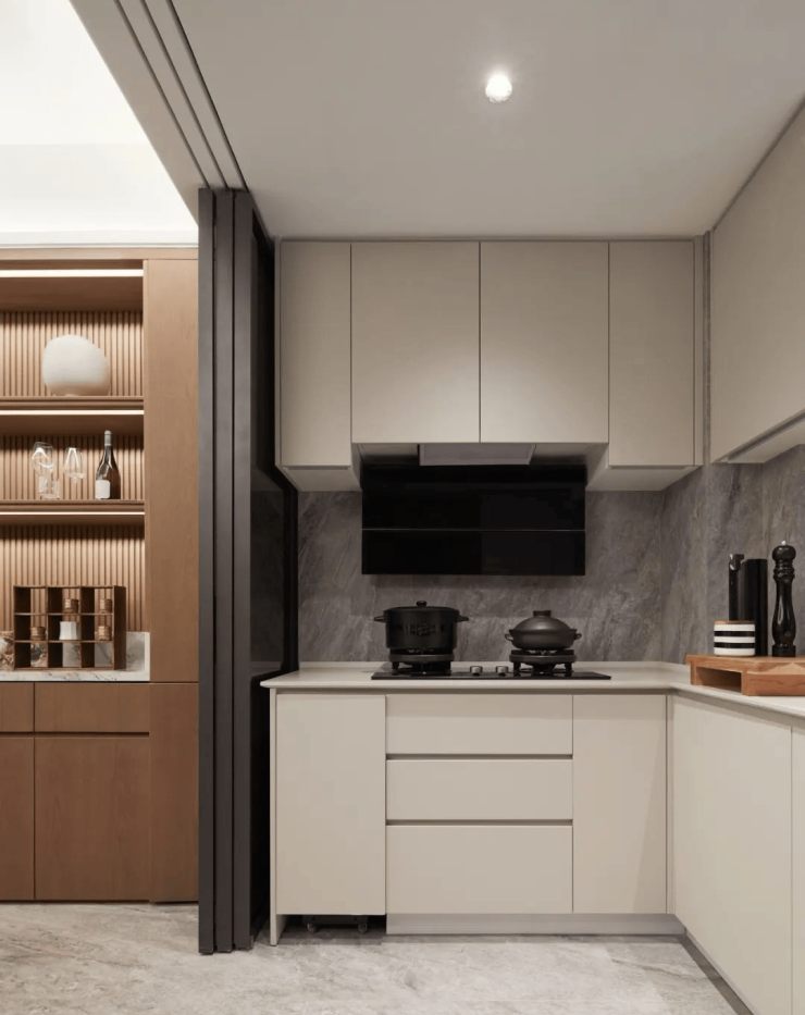 “分户S墙”设计在分户墙处增设“凹型空间”,“冰箱外移”增加厨房操作台面和收纳空间,让厨房从L升级为U型,创造更合理的餐厨桌台动线。