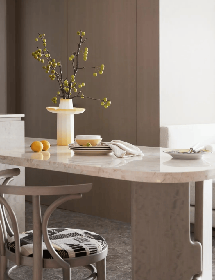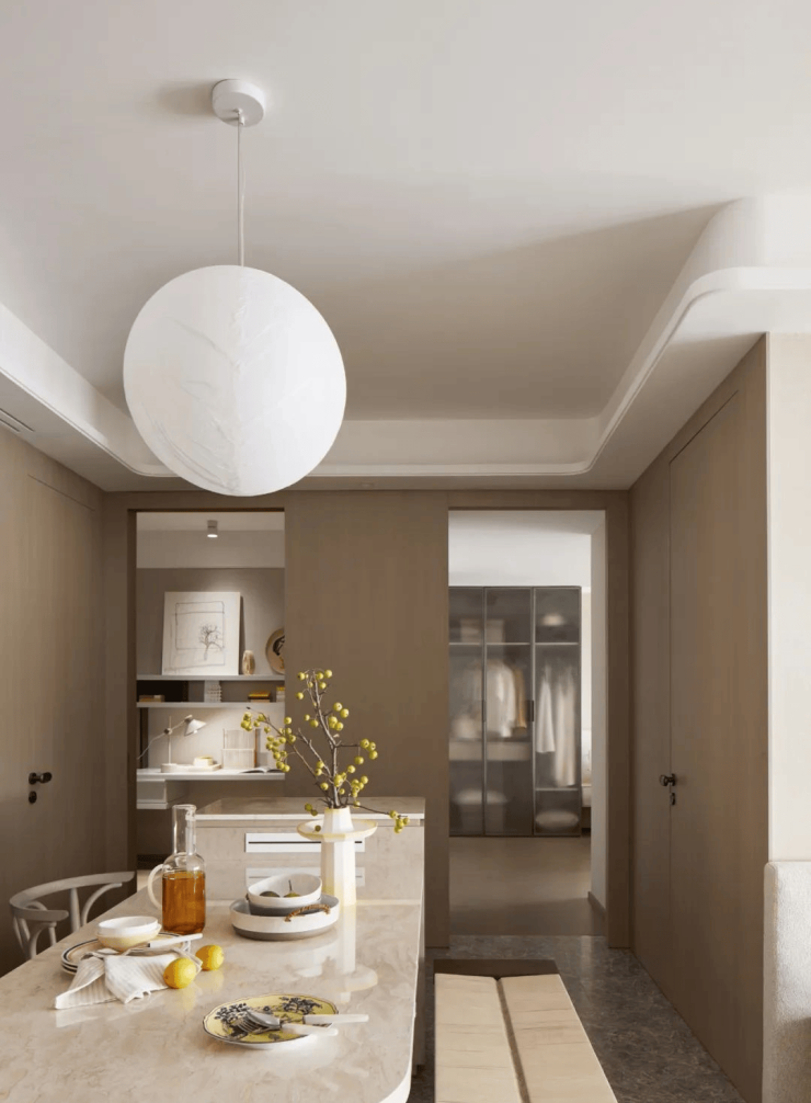 市场上传统的建面约100㎡户型,餐厅要么挤在客厅里,要么挤在厨房旁,给人第一感观就是很局促。而海上映象的建面约100㎡户型,餐厅不依附于任何另外,通过“长岛桌台”设计,呈现一个“有大桌子的家”。这一点很重要,是小家显大的精髓。不仅将传统狭长过道餐桌拓宽为长岛社交区,更搭载多收纳功能桌台,包容工作、娱乐、用餐等多元场景,让餐桌升级为全家庭生活故事演绎中心。