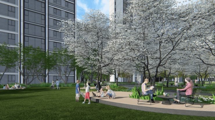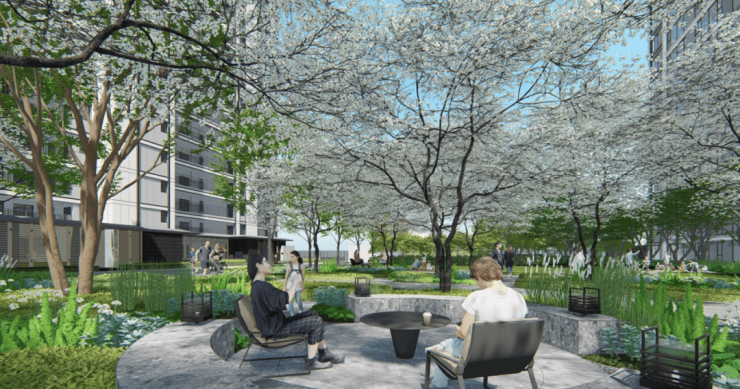 升级点二:西侧景观组团全新升级,原有的疗愈植物园新增樱花林,所选的染井吉野樱品种,花蕾期呈现深红色,开花初期呈淡粉色,盛开时接近白色不仅丰富了绿植品种还增添了视觉享受。